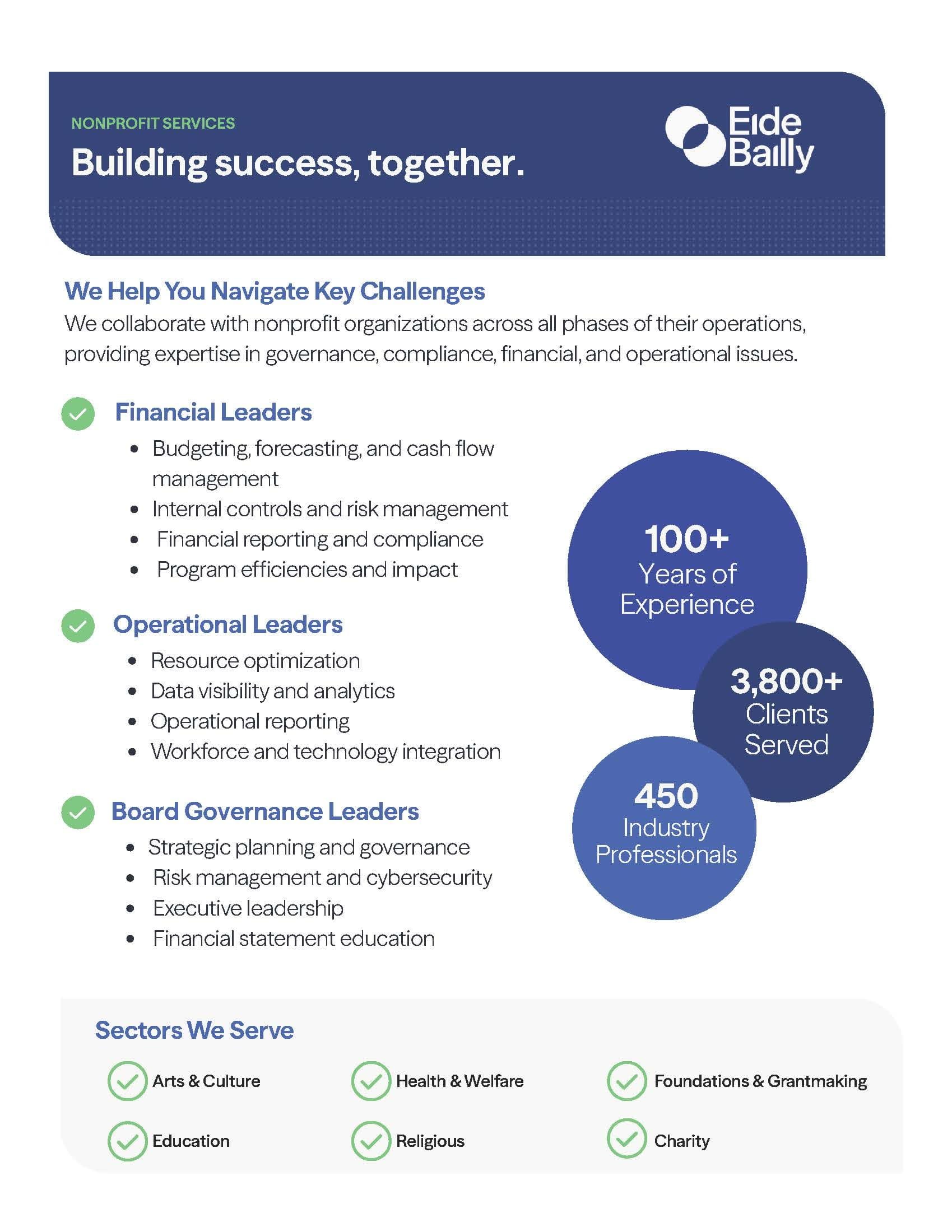 Eide Bailly serves thousands of nonprofit organizations across the country and is deeply committed to helping mission‑driven entities thrive. Our team understands the complex financial, operational, and regulatory environment nonprofits navigate, and we stay closely connected to the sector through ongoing training, community involvement, and long‑standing relationships with industry partners. This focus allows us to deliver practical guidance, strengthen organizational resilience, and support nonprofits as they work to advance their missions.