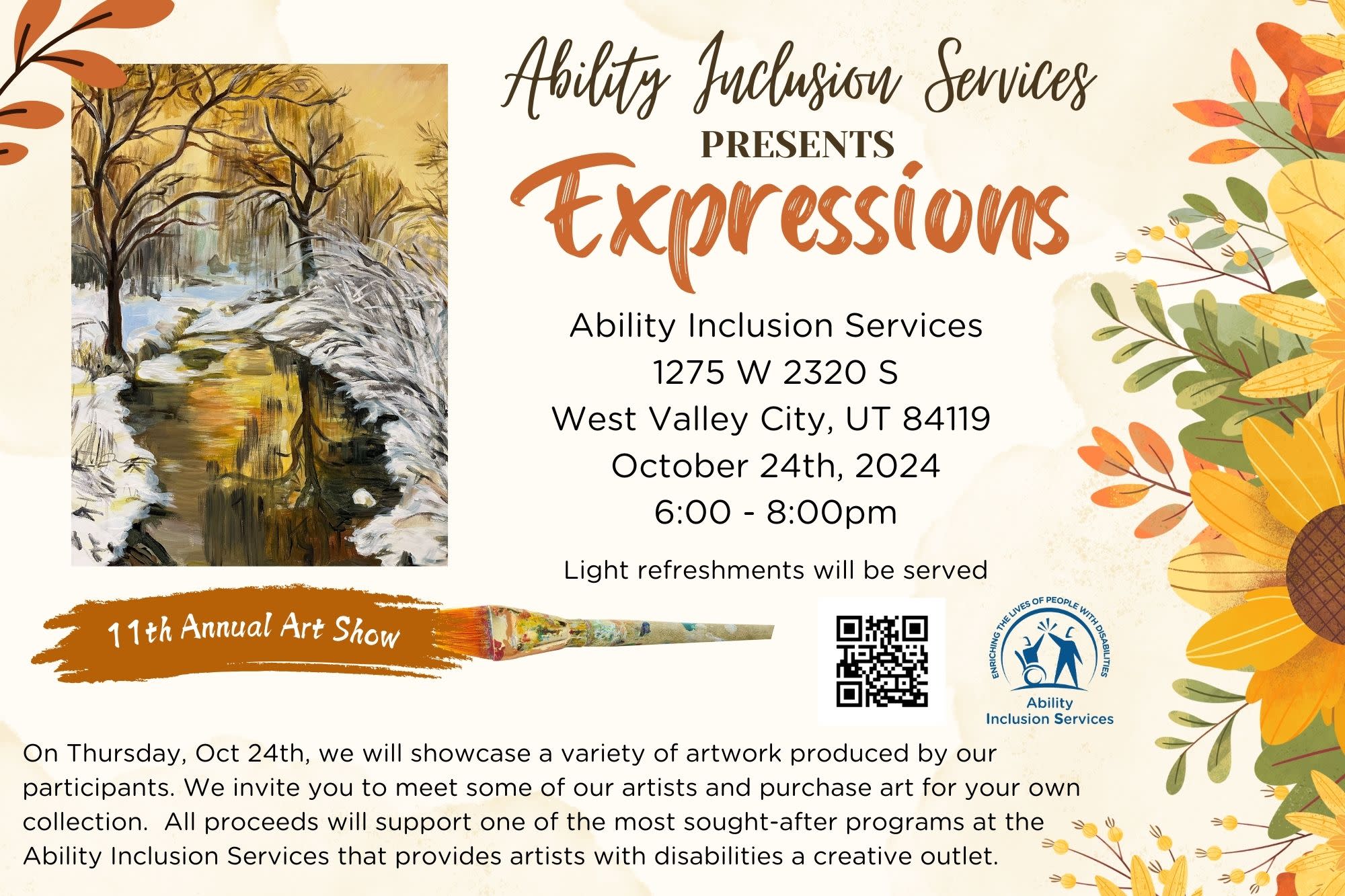 On Thursday, October 24th, we will present a diverse collection of artwork created by our talented participants. We invite you to meet some of our artists and consider adding their pieces to your collection. This event is a fundraiser for our Creative Arts program, one of the most popular offerings at Ability Inclusion Services. All proceeds will support this vital program, which provides a creative outlet for artists with disabilities.