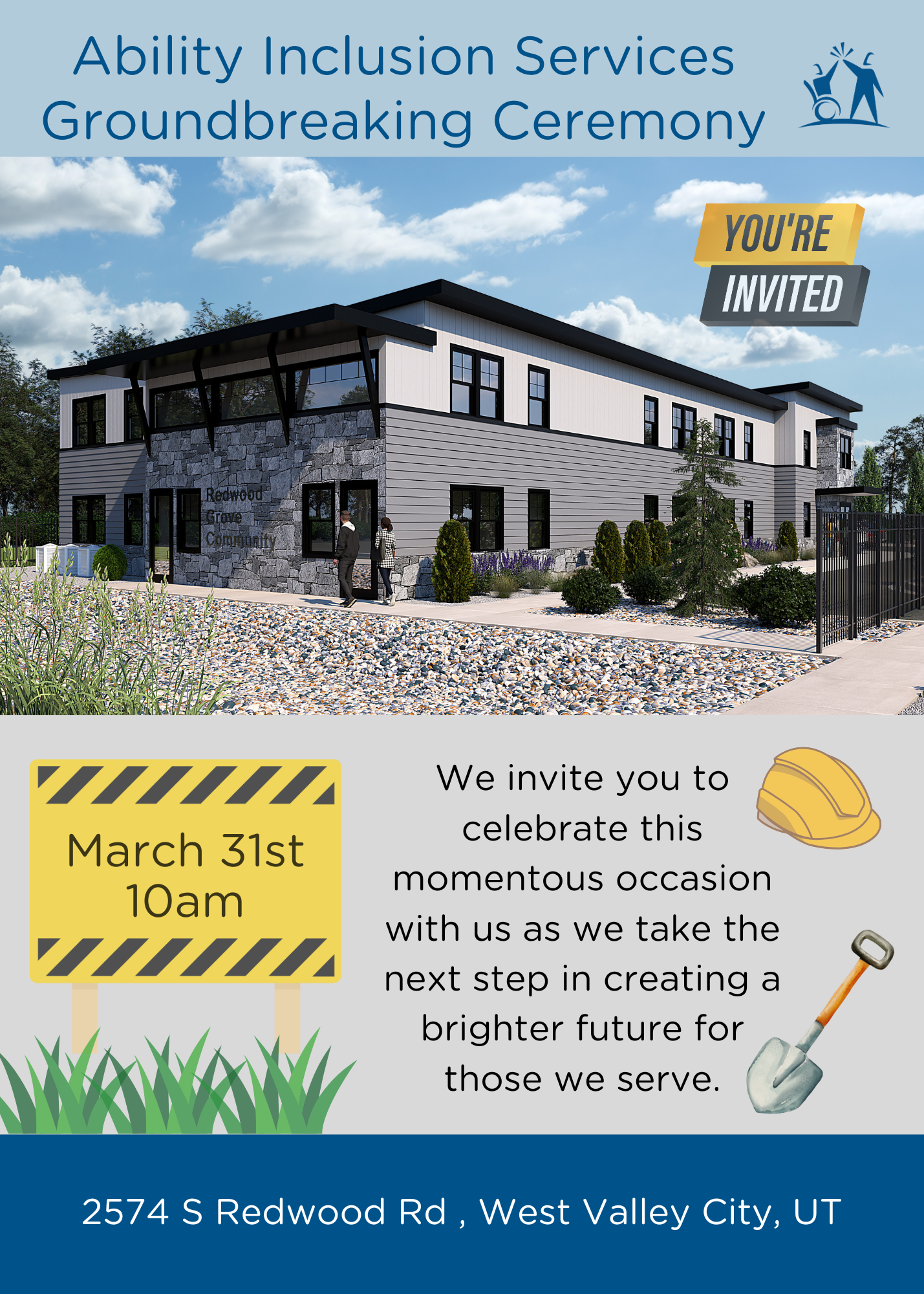Join us as we take this exciting next step toward creating more inclusive housing options. This project is more than just a building, it’s a commitment to independence, accessibility, and belonging. Come celebrate this milestone with us! Afterwards, we'll have a small gathering with refreshments at the Center: 1275 W 2320 S West Valley City.